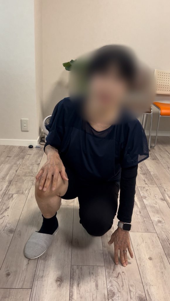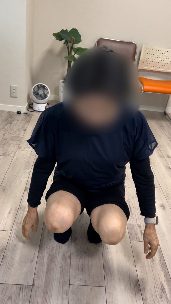実際にしゃがんでみると「ここまでです、ここで膝が痛いです」とのことでした。