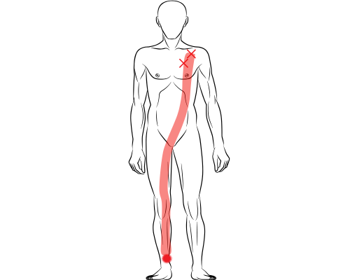 実は押さえると痛かった左胸の筋膜のポイントと、右足のスネの内側はスパイラル(らせん状)に繋がりを持っているんです。