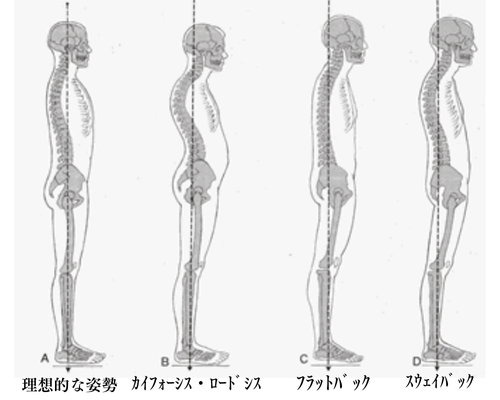 左から2番目のカイフォーシス・ロードシス(Kyphosis-lordosis)や一番右のスウェイバック(Sway-back)は反り腰を生じやすい姿勢の代表例となります。