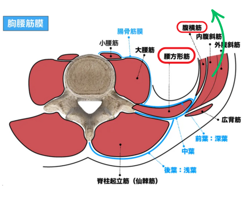 腰方形筋は腰痛を生じる原因の筋肉の1つでもあるので、腹横筋の働きが悪いと緑矢印で示した方向に腹横筋が短縮してしまい、その分、腹横筋と連結している腰方形筋がズルズルと外側(右側)に引っ張られてしまいます。