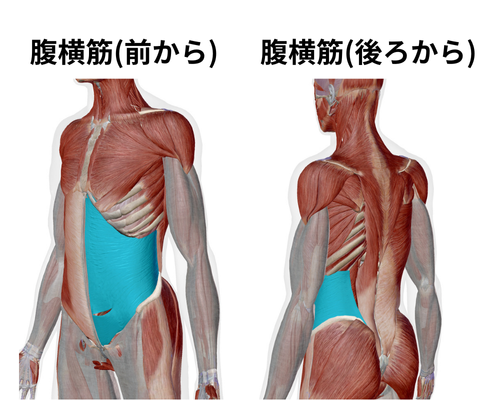 上の図を見てもらうとわかるように腹横筋は「腹」という言葉が入りますが、前方から後方の「腰」まで広範囲に存在している事がわかると思います。