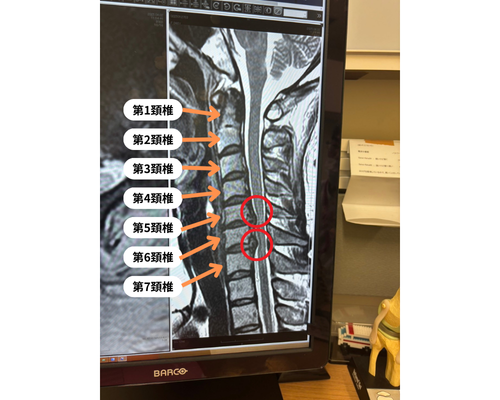 当院に来院される前に、病院でMRI検査を受けて第5頚椎と第6頚椎間、第6頚椎と第7頚椎間の頚椎ヘルニアの指摘を受けて内服薬も処方されて経過を見ていましたが、なかなか改善されず頚椎の手術も提案を受けたそうです。